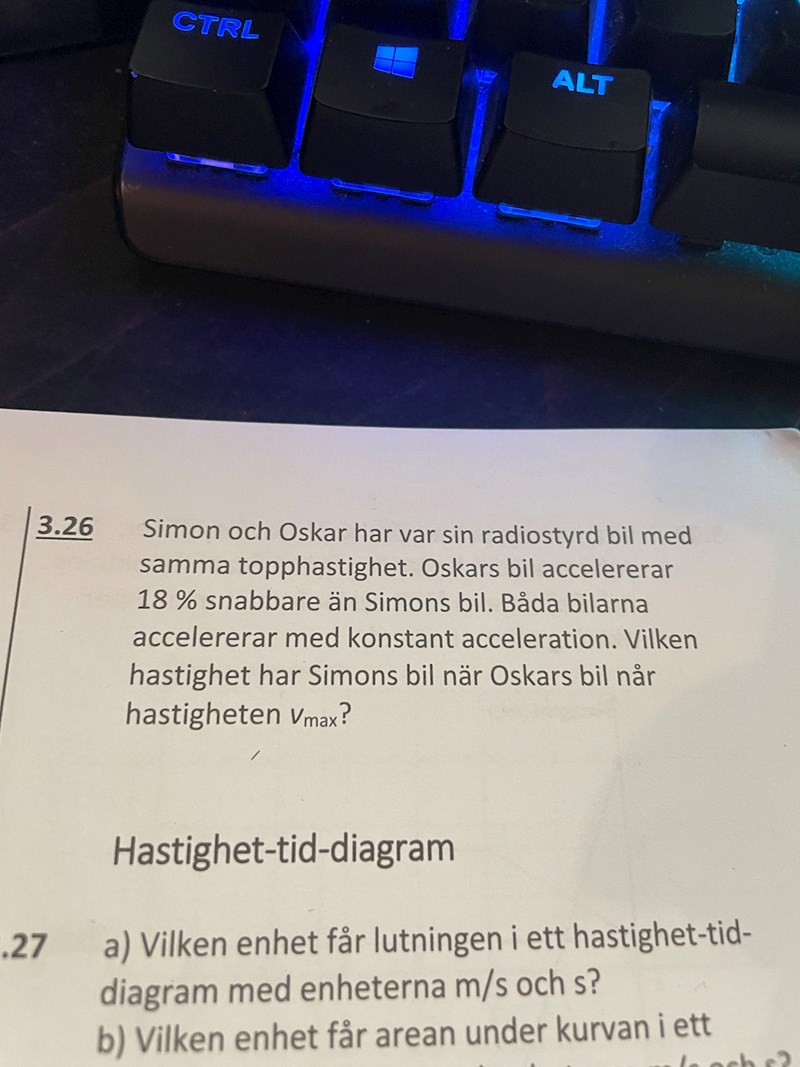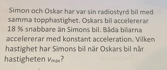 Om Simons bil har nått hastigheten vmaxSimon så gäller det att vmaxSimon = 1,18at, så t = vmaxSimon/1,18a. Då har Oskars bil fått hastigheten vOskar = at = avmaxSimon/1,18a = vmaxSimon/1,18 = 0,85vmaxSimon.