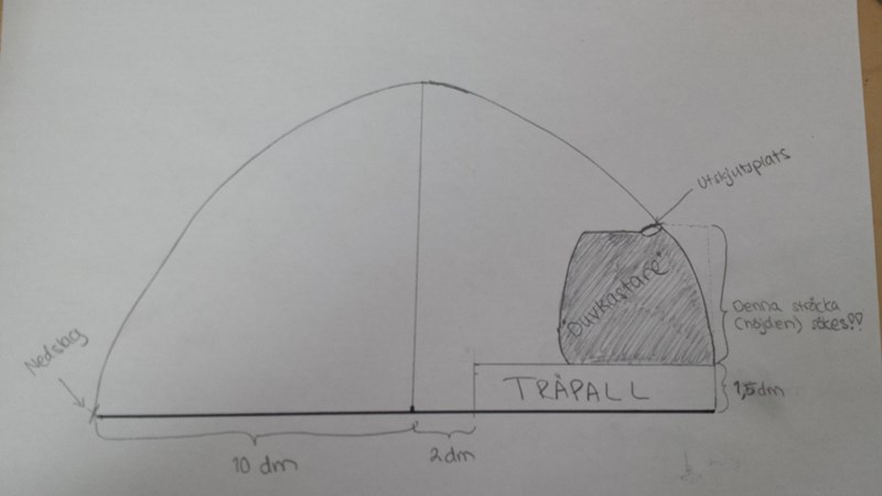 Jag förstår inte hur jag ska lista ut höjden? Har försökt med alla möjliga grejer, men jag tror jag på något sätt behöver använda mig av höjden på träpallen (1,5 dm) och dess avstånd (2 dm) till maximipunkten.