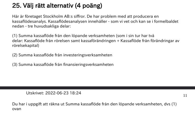 I två timmar nu har jag läst om samma kapitel i faktaboken och försökt räkna ut vad kassaflödet från den löpande verksamheten ska uppgå till, utan resultat, utifrån denna uppgift: