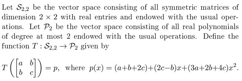 Jag skulle vilja räkna ut Ker T och Range T. Kernel är väl settet av vektorer från S_22 som blir mappade till 0 i P_2 ?