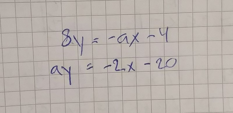 Tack, mitt mål är att få x att bli samma i båda ekvationerna och m att bli olika så linjerna blir parallella, men det går inget vidare. Har försökt dela med 8 och a men det ställde bara till det för mig... Har verkligen kört fast.
