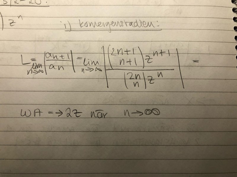 Ang din beräkning undrar jag om inte, när du i täljaren ersätter n med n+1, det då ska stå 2(n+1) istället för 2n+1 överst? Då får jag gränsvärdet A =4 som ger konvergensradien R=1/4.