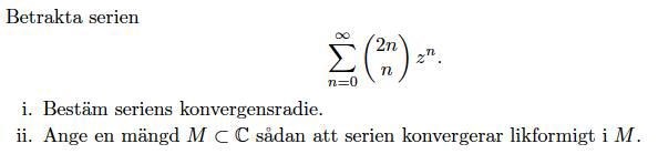 Tomten skrev:Ja, UPPGIFTEN handlar om en serie, så långt är det rätt. Men det EXEMPEL du relaterar till (med den engelska texten) handlar inte om en serie utan en funktionsFÖLJD. Ratio test (=kvotkriteriet på svenska) används för att avgöra om en viss serie konvergerar eller inte. Om du sätter in ett värde på z så får du en serie där kvotkriteriet kan hjälpa dig att avgöra konvergensen, men då har du bara gissat på konvergensradien. Om t ex kvotkriteriet säger konvergens för z=1 så vet du bara att konvergensradien är minst 1, men den kan vara större. Konvergensradien ges av formeln jag försökte skriva med min eländiga dator. (Den brukar kallas "rotkriteriet" till skillnad från "kvotkriteriet") På alla kompakta delmängder inom konvergenscirkeln konvergerar en potensserie likformigt och absolut mot en s k holomorf (eller med ett annat ord analytisk) funktion). Om du vill lära dig om potensserier, tror jag du har haft lite otur i valet av uppgift. Har sett en utredning kring en potensserie med binomialkoefficienter och den var inte rolig. Försök att först hitta en uppgift där koefficienterna an lättare låter sig beräknas med ROTKRITERIET, så tror jag du vinner större klarhet i begreppen. Därefter kanske du kan ge dig i kast med den aktuella typen.