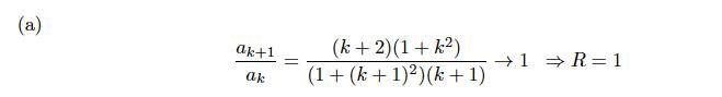 Betr. den andra uppgiften: ak+1 /ak i facit är ett dubbelbråk från början. Förenklar man det erhåller man det stora bråket i HL. Både täljare och nämnare i det bråket är av 3:e graden. Bryt ut k3 ur både täljare och nämnare. Du får ett uttryck med konstanten 1 och termer av typ 1/kp där p>=1 i både täljare och nämnare. k ska gå mot oändligheten. Dessa termer går då alla mot 0 och kvar står endast 1/1=1. Med bn får vi alltså 1*abs(z )= 1. Enligt dÁlambert konvergerar då serien om abs(z) < 1 och divergerar om abs(z) > 1. Det betyder att konvergensradien R =1. Ber om överseende om jag missuppfattade dig från början.