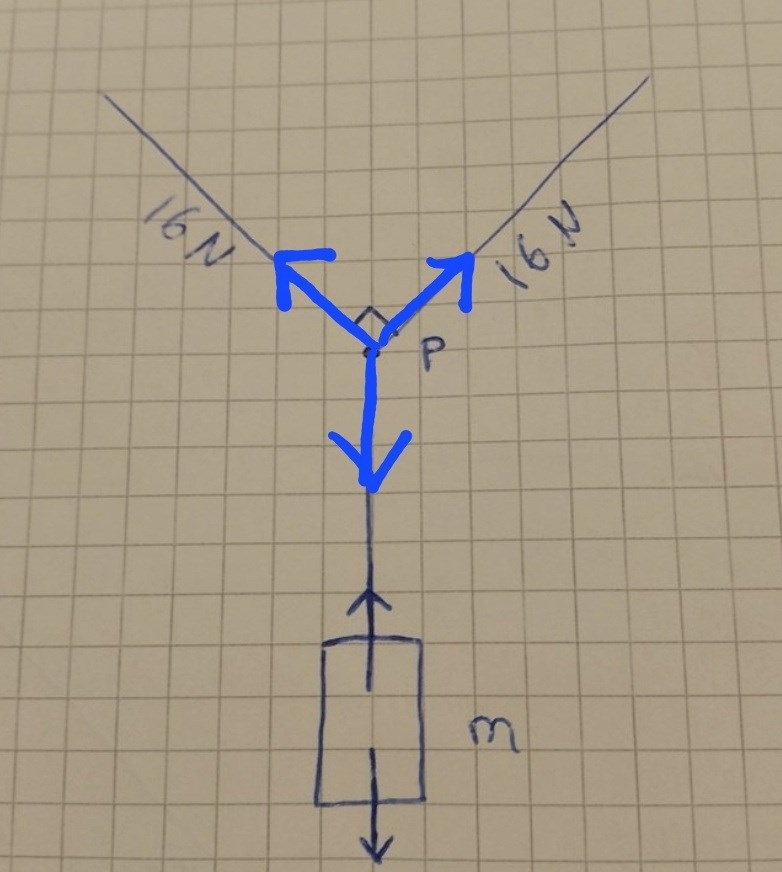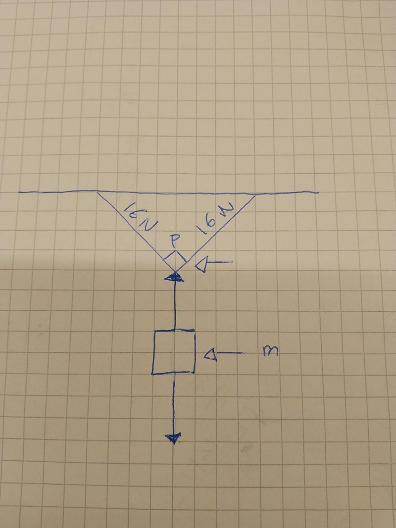 En vikt med massan m hänger i en lätt tråd. Tråden är i punkten P fäst i två andra trådar som bildar vinkeln 90 grader med varandra. Kraften är 16 N i vardera av dessa snett riktade trådar.