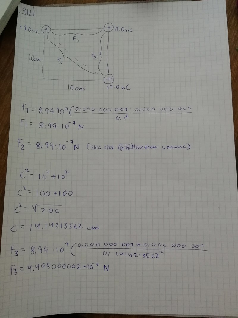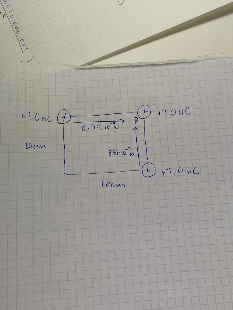 Tre laddade partiklar med vardera laddningen +1 nC aitter i tre hörn av en kvadrat med sidan 10 cm. Bestäm storlek och riktning på den resulterande kraften på partikeln P i figuren.