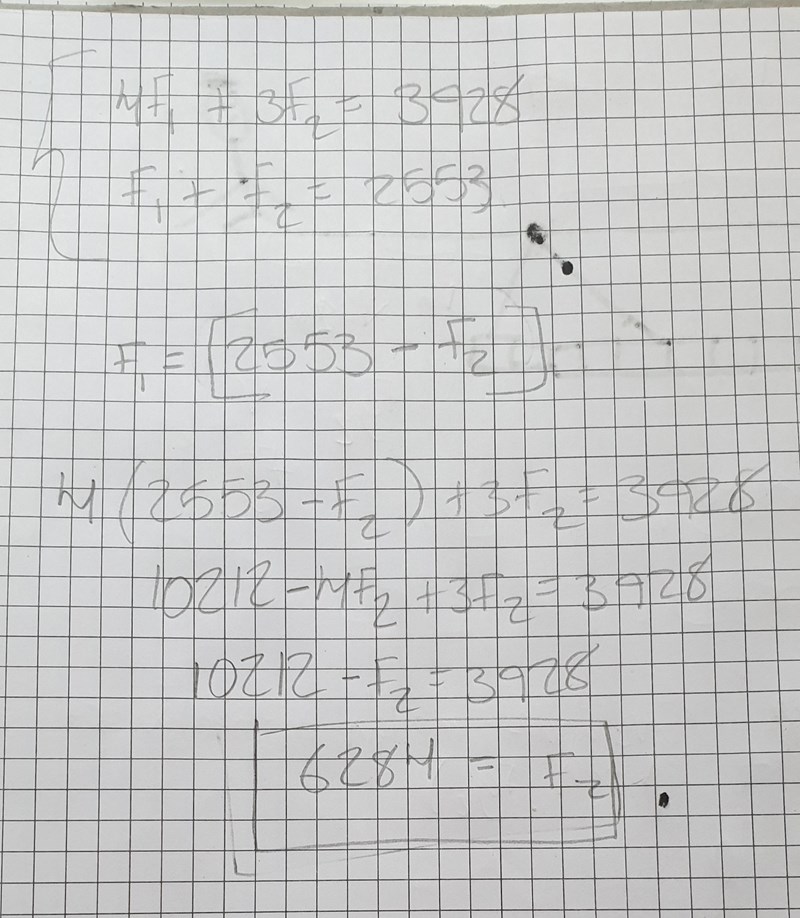 Nu tog jag en längre väg men det andra sättet är att sätta momentpunkten vid F1 och räkna ut F2.