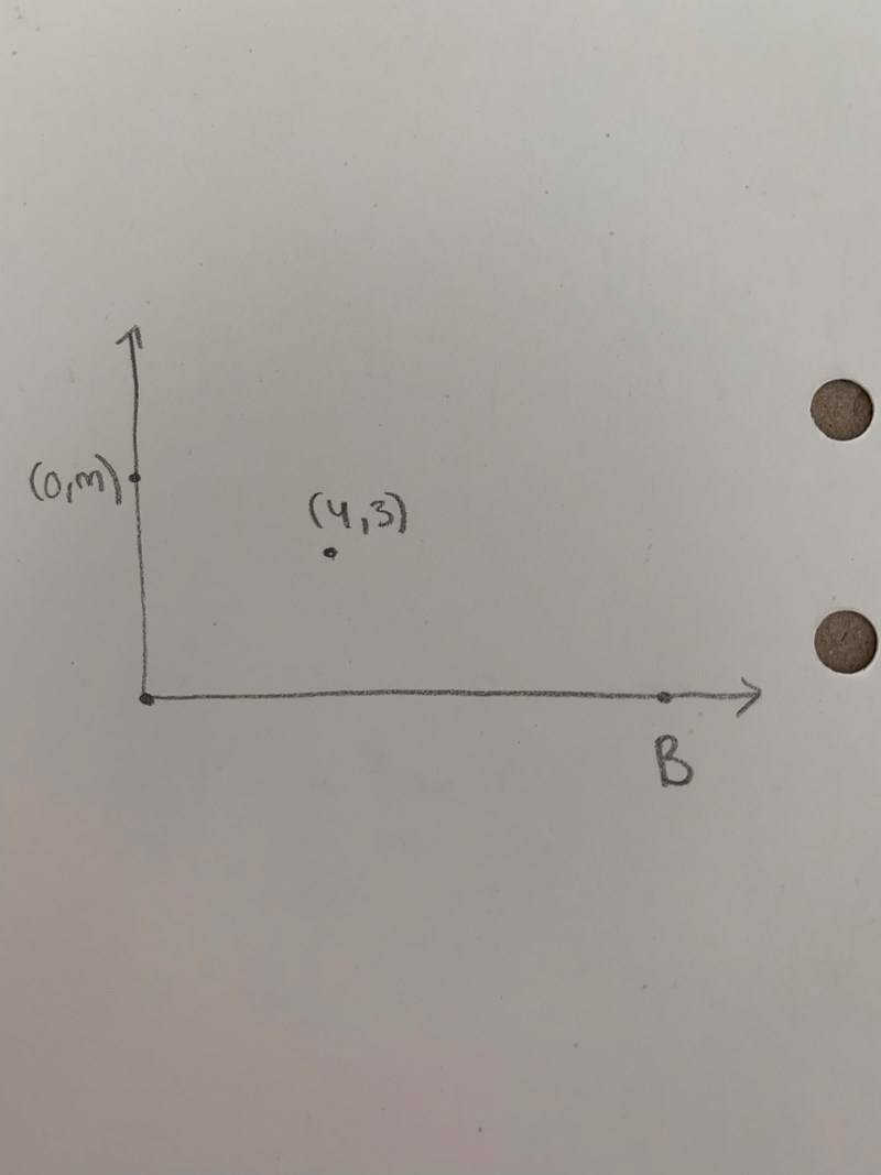 Jag har länge fastnat på denna typ av uppgift. Det bilden nedan visar är det enda man får veta. Uppgiften är att räkna ut längden av x-axeln till punkten B med hjälp av m (som skär y axeln). Jag har testat att räkna med k-värde, men får inte till det. Svaret till uppgiften har jag inte heller, men har hört ett rykte om att B=5m. Det kan vara fel.