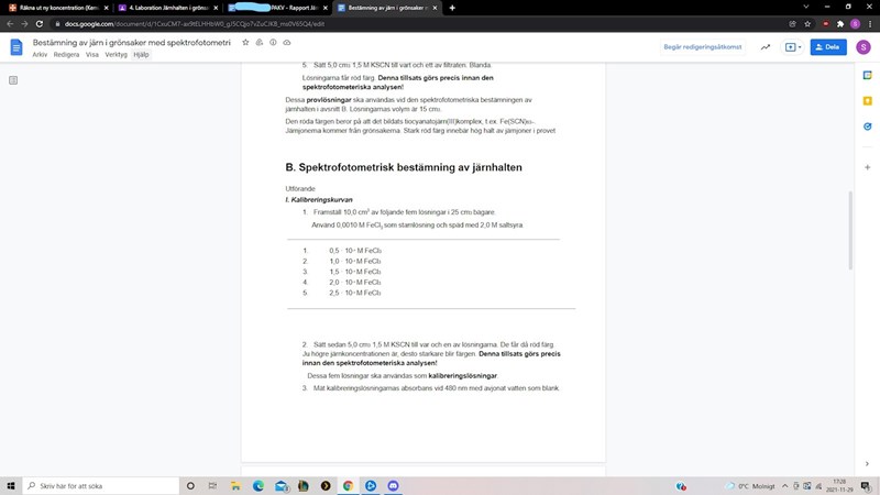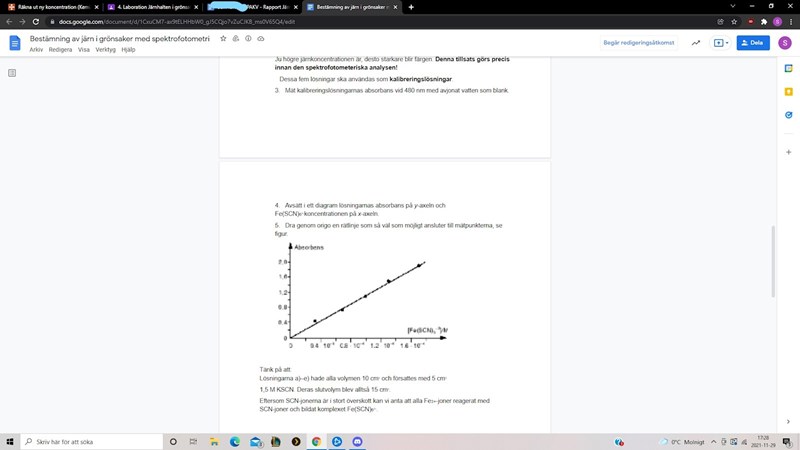 Sedan ska vi rita en graf med en rät linje som föreställer en kalibreringskurva, likt den som visar här nere, och genom det bestämma järnhalten i spenat. Jag har fått feedback från min lärare, och hon har skrivit att jag måste först räkna om koncentrationerna för dessa fem kalibreringslösningar då vi får en ny koncentration efter att vi tillsatt 5 ml av KSCN med koncentrationen 1,5 M. Hoppas att dessa bilder hjälper lite.