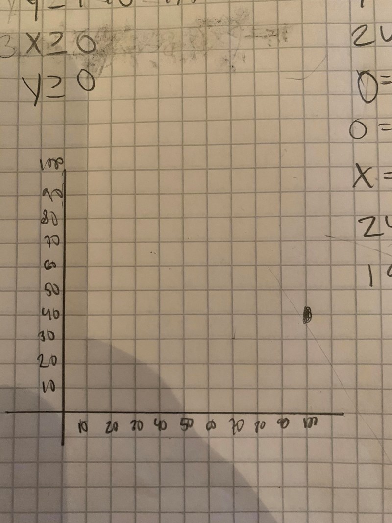 Nu har jag löst iallafall punkterna (100, 40) med hjälp av ekvationssystemet men det är två kvar där ena y-värdet ska vara 0 och ena x-värdet ska vara 0 i varsin punkt