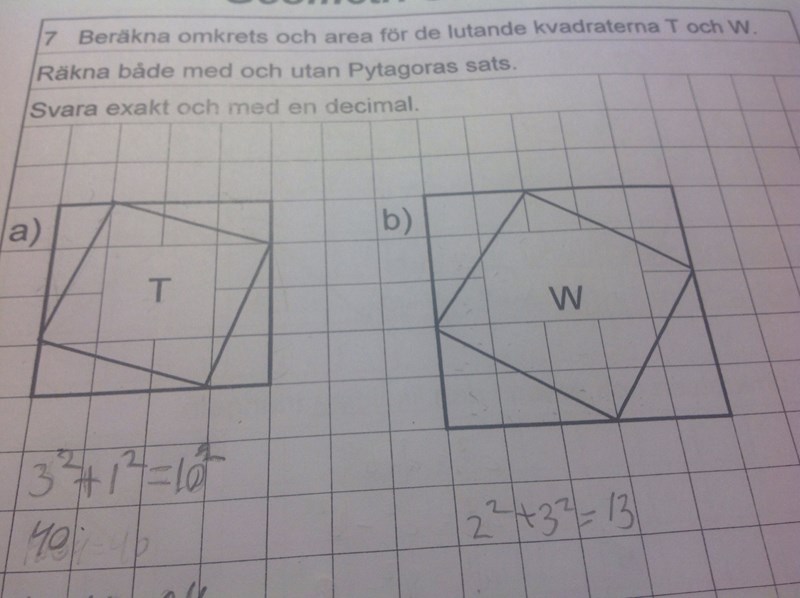 ska räkna ut omkrets och area med och utan pythagoras sats. Jag har tänkt med omkretsen på a:3^2+1^2=10^2 alltså varje triangels omkrets är 14cm. 14*4=56cm. Hela omkretsen på figuren är 14cm har jag fått det till men då blir det inte rätt.