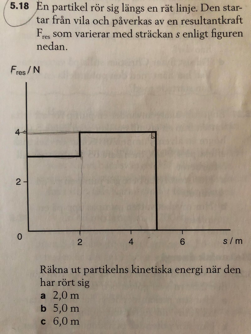 En partikel rör sig längs en rät linje. Den startar från vila och påverkas av en resultant kraft Fres som varierar med sträckan s enligt figuren nedan: