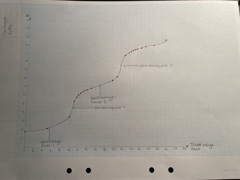 Det här innebär då självklart att du har tre stycken ekvivalenspunkter, inte bara två. När du gör en titreringskurva över ditt försök, så kan man av att enbart använda sig utav Ka-värdena räkna ut vilket pH du har i dina ekvivalenspunkter.