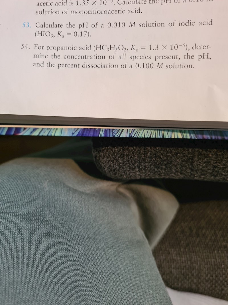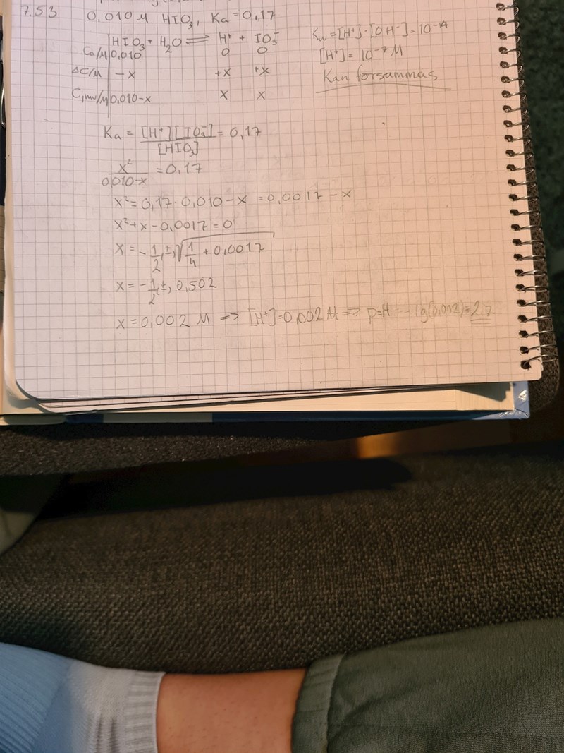 Hej jag behöver hjälp med uppgift 53.. jag har gjort ett försök men det funkar inte. Har också testat att lägga till [H+] från vattnet men det funkar inte. Facit säger 2.02. Har jag skrivit fel reaktionsformel eller nått? Någon som kan hjälpa mig?