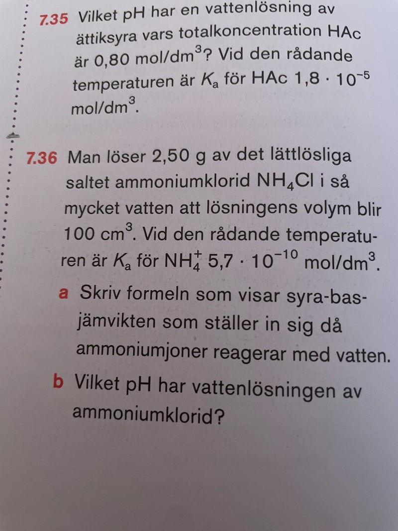 Hej! Jag har fastnat på uppgift 7.36. Jag har på börjat en lösning genom att räkna ut substansmängden på NH4Cl genom att ta massan/Molarmassan.