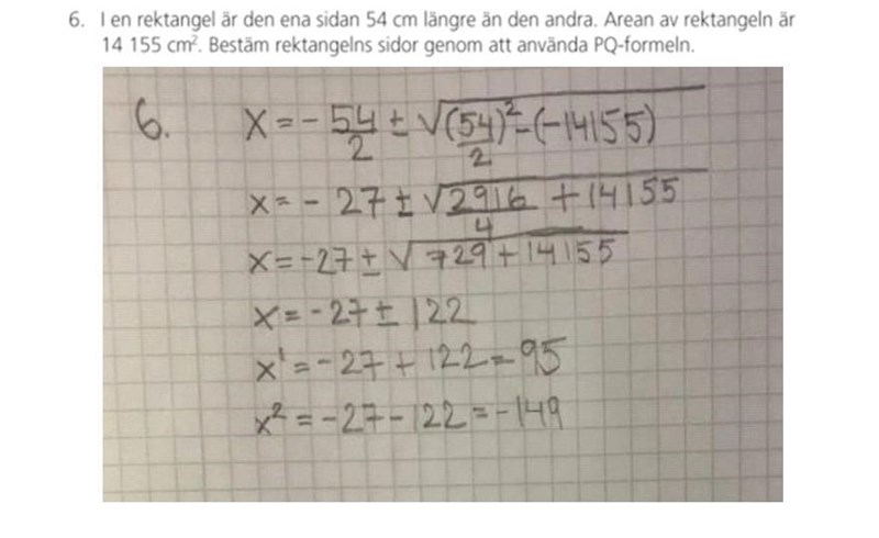 du fick att (vilket är korrekt) men du kan utesluta eftersom den är negativ vilket gör den orimlig då du efterfrågas sidorna på rektanglar vilket inte kan vara negativa