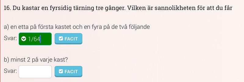 Jag förstår ej denna uppgift (uppgift b). Jag tänkte instinktivt att det var 3/4 x 3/4 x 3/4 eftersom att det är 3/4 att du får 2 eller högre (234) men då får jag ju 27/64 (3/7)?
