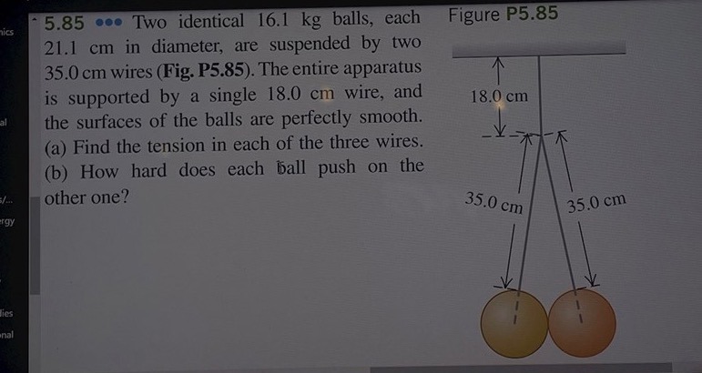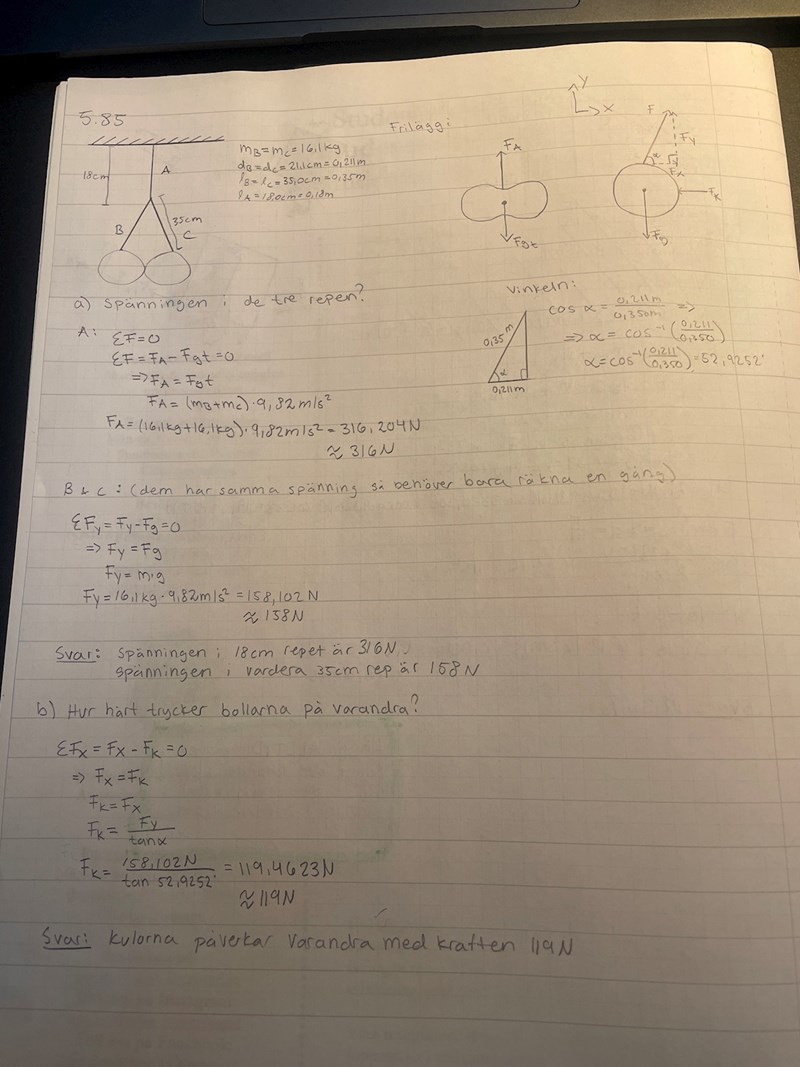 svaren ska vara 316N i det översta repet och 162N i de andra två. Och kraften bollarna påverkar varandra med ska vara 37,6N