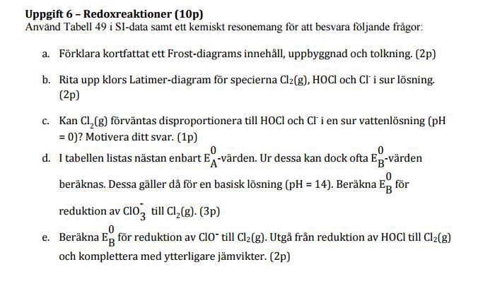 Hej jag håller på med en fråga om redox reaktioner. A, b och c kan jag det är d och e jag är fast på. På d tror jag man kan använda nernst ekvation för E genom att sätta pH 14 och använda E0A värdet. Men har inte riktigt fått ihop det. Så jag undrar om någon vet hur man ska ta dig till när man räknar ut E0B från E0A?