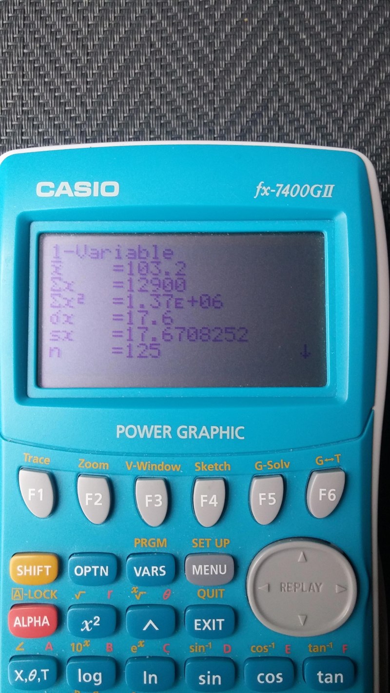 Men efter att ha matat in både värden och observationer, för att sedan kalkulera dessa, så får jag upp en lista med felaktigt standardavvik. Korrekt standardavvik är enligt facit =17,6 men räknaren visar 31,6