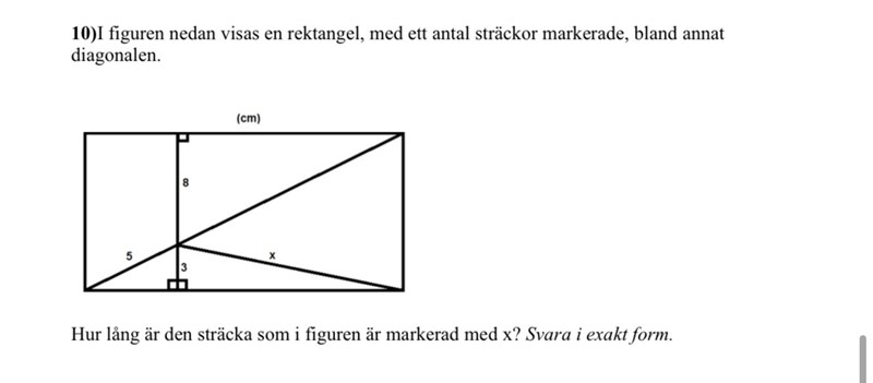 Jag kan inte lösa denna uppgift, suttit i två timmar nu! Jag tänker att liten triangel vänster och stor höger har samma förhållanden vilket ger den större hypotenusan 40/3. Större triangel (halva rektangel) borde då bli (4+y)^2 + 11^2 = (40/3)^2 och där får man en andragradsekvation och så vidare… men känns otroligt långsökt.