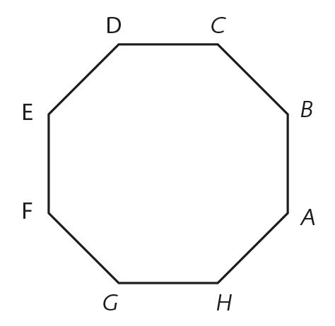 Förläng linjerna AB och DC så att de möts i punkten I. Hur stor är vinkeln I? Tänk på att åttahörningen är regelbunden, d v s att alla sidor är lika långa och alla vinklar är lika stora.