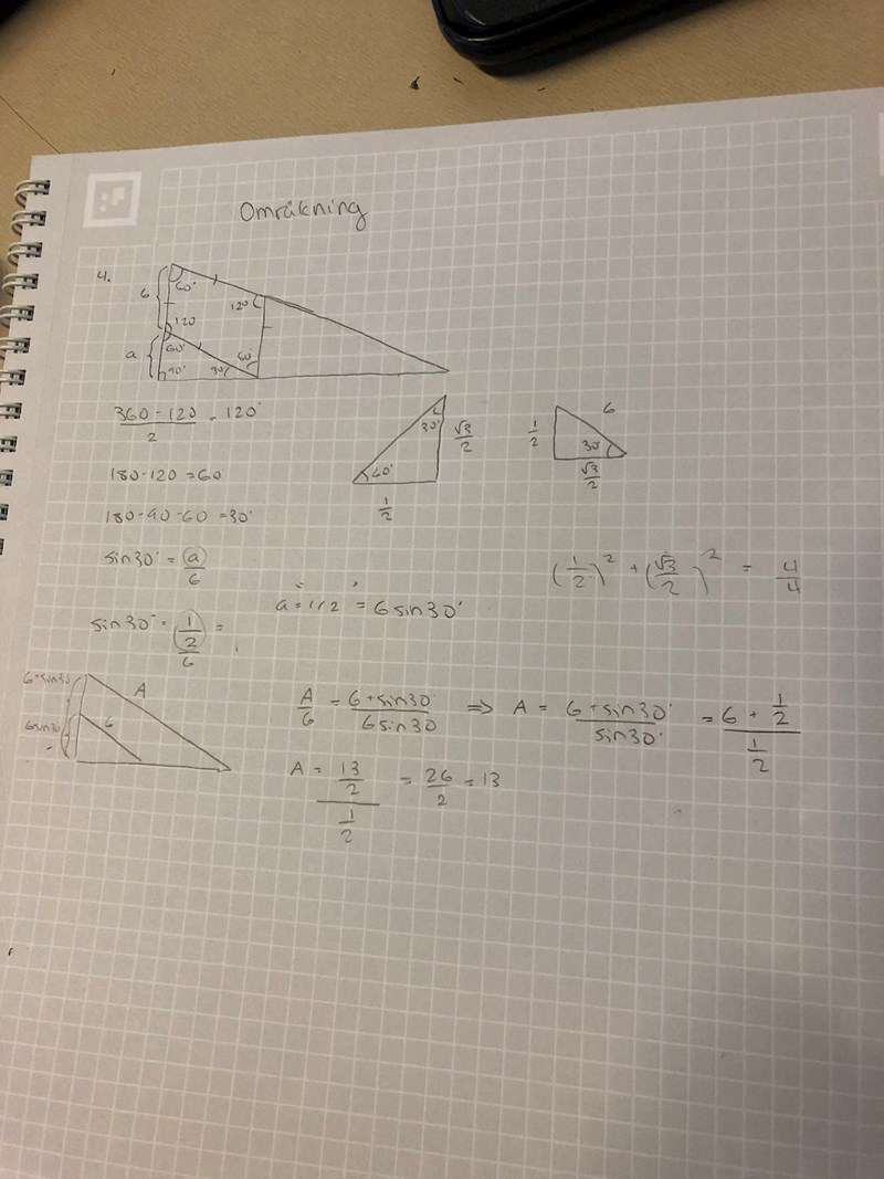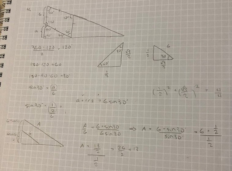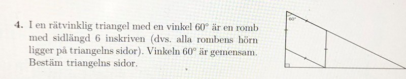 Jag skulle börja med att kalla den lodräta sidan i den minsta triangeln a och den vågräta b, och den sneda delen i den högra triangeln c och den vågräta d. Då har jag tre kongruenta trianglar, den minsta med sidorna a, b och 6, den högra med sidorna 6, d och c samt den stora med sidorna a+6, b+d och c+6. Eftersom du vet att en vinkel är 30o och en vinkel är rät, är alla trianglarna "en halv liksidig triangel" och du kan räkna ut alla sidlängder med Pythagoras sats (eller lite trigonometri).