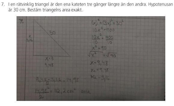 Du missa bara att du löste ekvationen i avseende till x alltså den kortare sidan. Den kortare sidan blir 9,48 och den längre 3*9.48=28,44