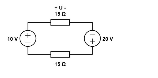 Allt är i serie, vad betyder detta för strömmen? Kolla på riktningarna av spänningskällorna, vad är det totala spänningen?