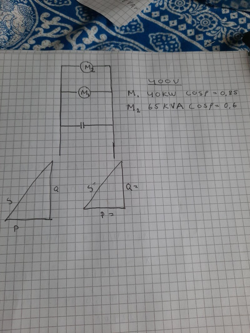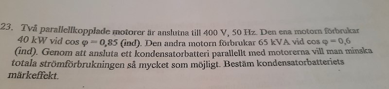 Jag antar att du vet att kondensatorn ska generera en lika stor reaktiv effekt som de båda motorerna, men negativ.