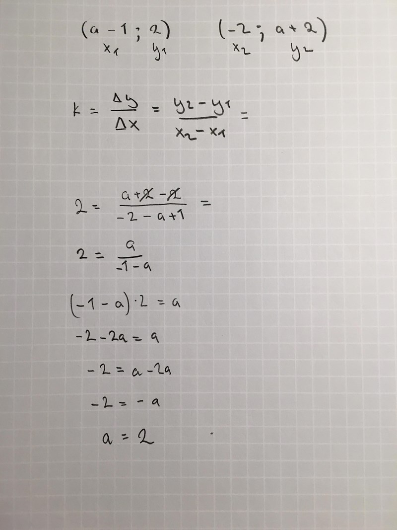 Vilka punkter är det i klartext? Vilka koordinater har alltså (a – 1; 2) och (−2; a + 2) om du sätter in att a = -2/3? Rita upp de båda punkterna och kolla att linjen genom dem har k-värdet 2.