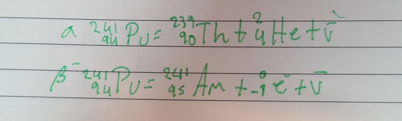 "Plotonium-241 kan sönderfalla både med alfa och beta- sönderfall. Skriv sönderfallsformlen och beräkna hur stor energi som frigös vid respektive söverfall"