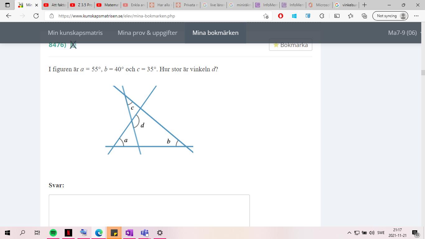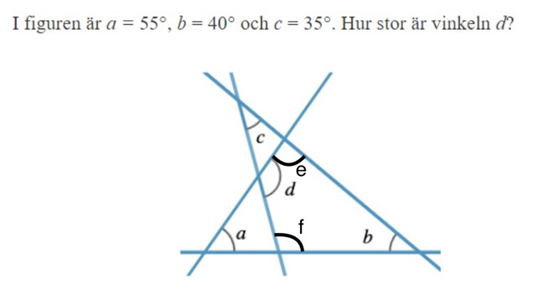 Sista vinkeln som vi kan markera är den som återstår i trianglen med hörnen b och c. Kalla den för fNu vet du att: