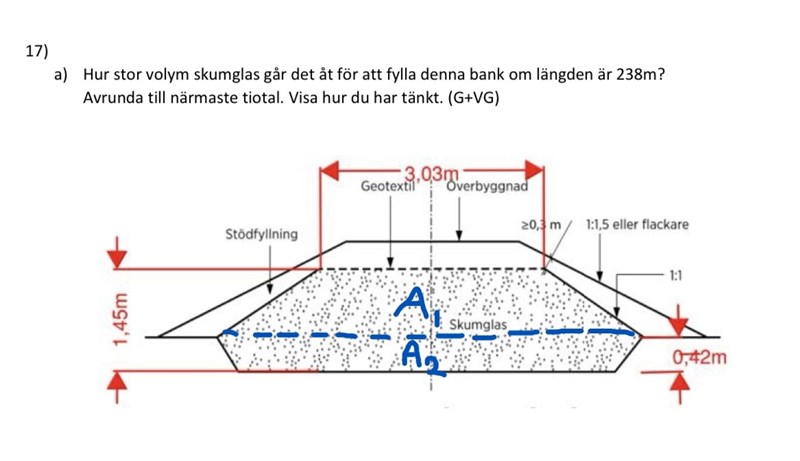 Hej jag behöver lite hjälp med att lösa denna uppgiften, man ska beräkna volymen, jag delade in figuren i två areor för att det ska bli lättare att räkna ut. A1 fick jag 4,18 m2 . Hur räknar jag ut den andra arean om jag inte har lutningen. Svaret ska bli 1460m3