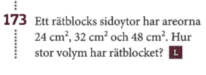 Om sidlängderna är , och . Vad är volymen av rätblocket?