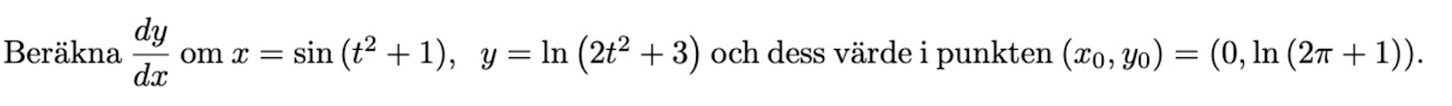 Har hittat derivatan genom att lösa för t^2 i första ekvationen och sätta in i andra ekvationen. När de frågar om värdet i punkterna (0,(ln(2pi+1)) , menar de derivatans värde i den punkten? I sådana fall så borde det väl vara så att derivatan är oberoende av y värdet eftersom den är en funktion av x?