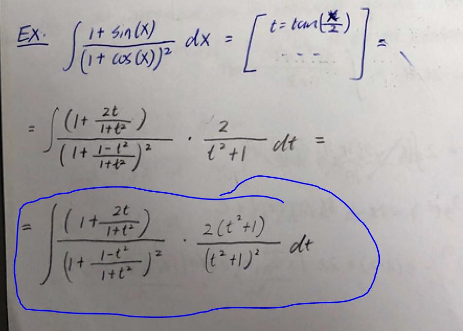 Jag fick (t^2+1)/2(t^4+1) istället för den som står i den blåa ringen.