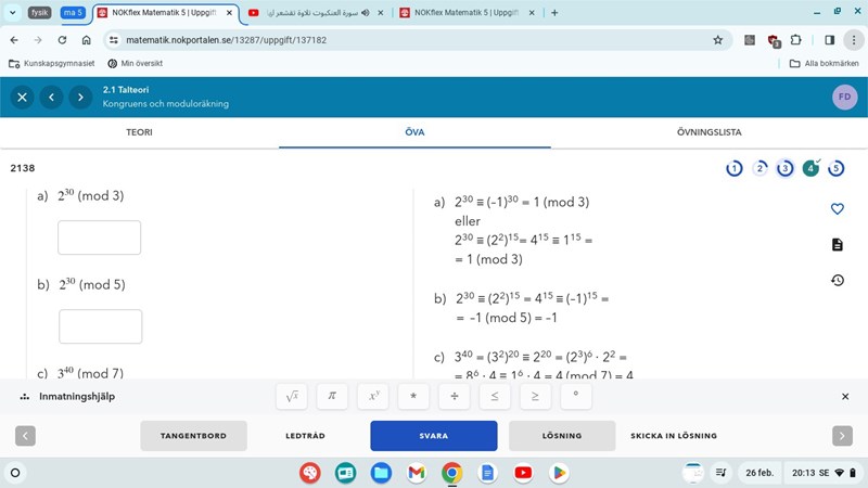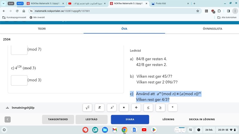 Hej, jag behöver hjälp vad gäller sådana, på c frågan kan ni se vilken regel de använt sig av (den jag markerat med blå), och jag försökte få den regeln att funka på de tre frågorna nedanför men det går inte på b och c utan bara p a), de gör på annat sätt istället, så jag undrar varför jag inte kan använda den regeln på dessa frågor och hur vet jag när jag kan använda den? Är det ksk bara när a och n skiljer sig åt med ett bara a(modn)