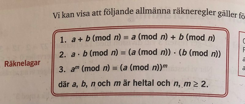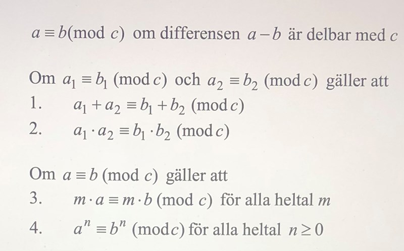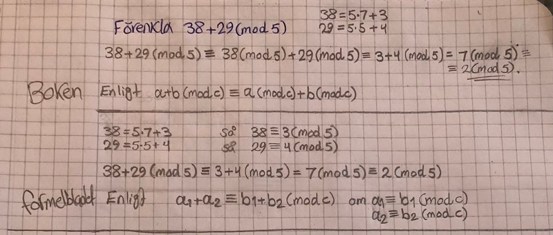 Boken säger att man bestämmer resten för varje term och adderar dem. Det kanske betyder att resten av en några tal är kongruent med summan av talens rester.