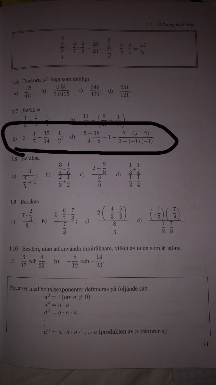 d) Räkna ut de två olika nämnarna, hitta MGN, och gångra de olika bråken så att alla får samma nämnare. Sätt på samma bråkstreck och räkna ut. Sedan förenkla.