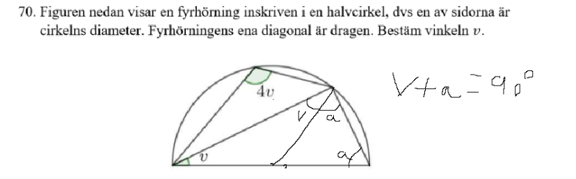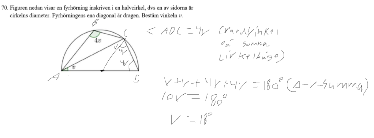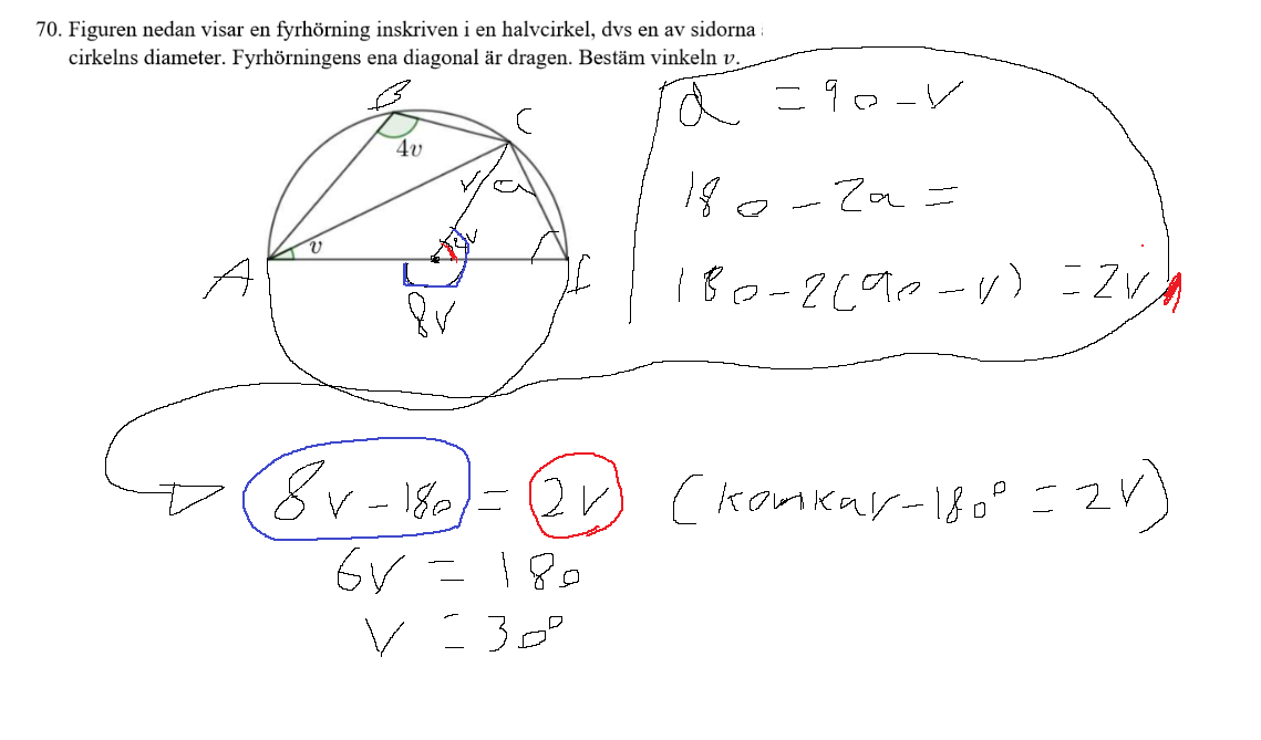 Satsen du nämnde om en fyrkant inskriven i en cirkel gäller bara om den är inskriven i en hel cirkel, eller i en valfri del av en cirkel om två vinklar garanterat är 90 grader. I detta fallet har inte fyrkanten två räta vinklar i halvcirkeln så den satsen gäller inte, även om svaret för det blev rätt antar jag att det var av ren slump. Men oavsett lyckades jag lösa den. Randvinkeln 4v har en medelpunktsvinkel som är 8v. Dessutom så vet jag att vinkeln som är rödmarkerad är 2v. Om jag då bara tar 8v-180 får jag den vinkeln som är rödmarkerad, den som är 2v. Därefter gör jag en enkel ekvation och får att v=30 grader.