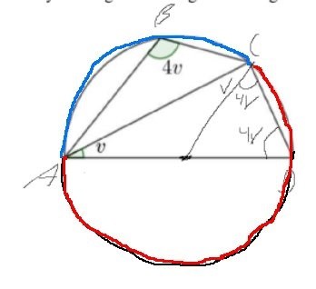 Nu tänkte jag att vinkel ADC är 4v eftersom den är en randvinkel på samma cirkelbåge som vinkel ABC. Dessutom konstaterade jag att vinkel CAD är samma som en av vinklarna vid ACD, nämligen den som bara är "v" eftersom de är basvinklar på grund av att det är en likbent triangel. Då får jag att 10v ska bli 180 grader, men då får jag 18 och inte 30. Det kan vara så att vinkeln jag satte som 4v egentligen är 2v, men jag ser inte det som en klassisk randvinkel där ena vinkeln är dubbelt så stor som den andra eftersom det inte finns någon klar mittpunkt utan bara faktumet att de delar samma cirkelbåge?