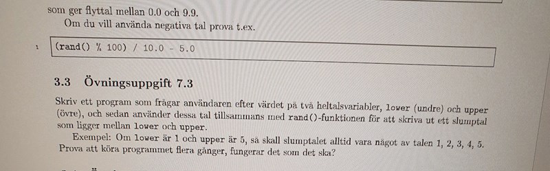 anders_k skrev:random = rand() % (upper - lower + 1) + lower;rand() ger ett heltal i intervallet [1,RAND_MAX] (max varierar med kompilator) man vill få in det värdet i intervalet [lower,upper] så man tar reda på först hur stort intervallet är upper-lower+1