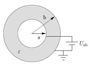 Har två cylindrar med radie a respektive b där b>a och längden L>>b. Mellan ledarna finns luft med permittiviteten . Ett batteri med spänningen Uab kopplas med den negativa elektroden till den yttre cylinder och den positiva till den inre enligt bild. Efter ett tag har den inre +Q laddning och yttre -Q (när kondensatorn är fulladdad).