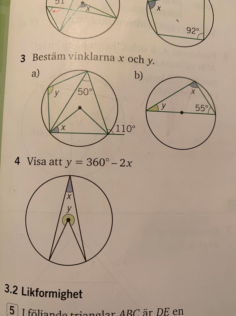Hej! Behöver hjälp ned uppgift 3 b). Jag har kommit fram till att sidovinkeln till vinkeln som är 55 grader är 125. Alltså är y + x = 125. Har även kommit fran till att: 55+y+x=180 grader. Har dock fastnat nu. Vet inte riktigt hur jag ska ta mig fram, har inte jobbat jättemycket med denna sats! Vill någon ge lite tips?