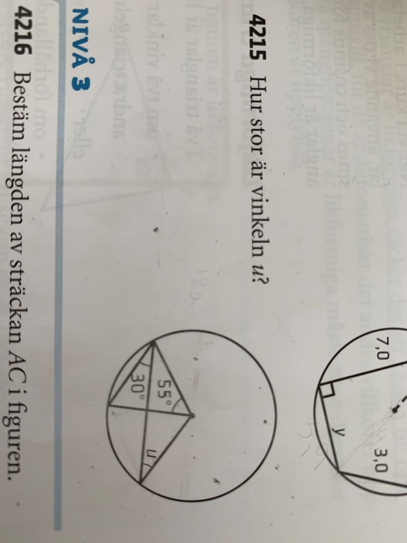 Hej förstår ej fråga 4215, jag fick svaret till 35 grader men facit var 32,5 grader. Jag fick att mittpunkten var 110 grader och sedan skrev jag upp: 180=110+ 2u, för den översta delen är väl likbent?