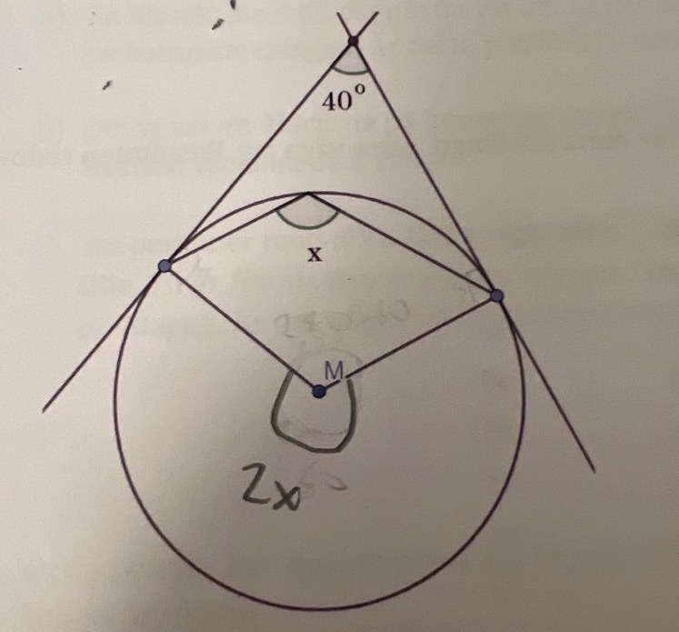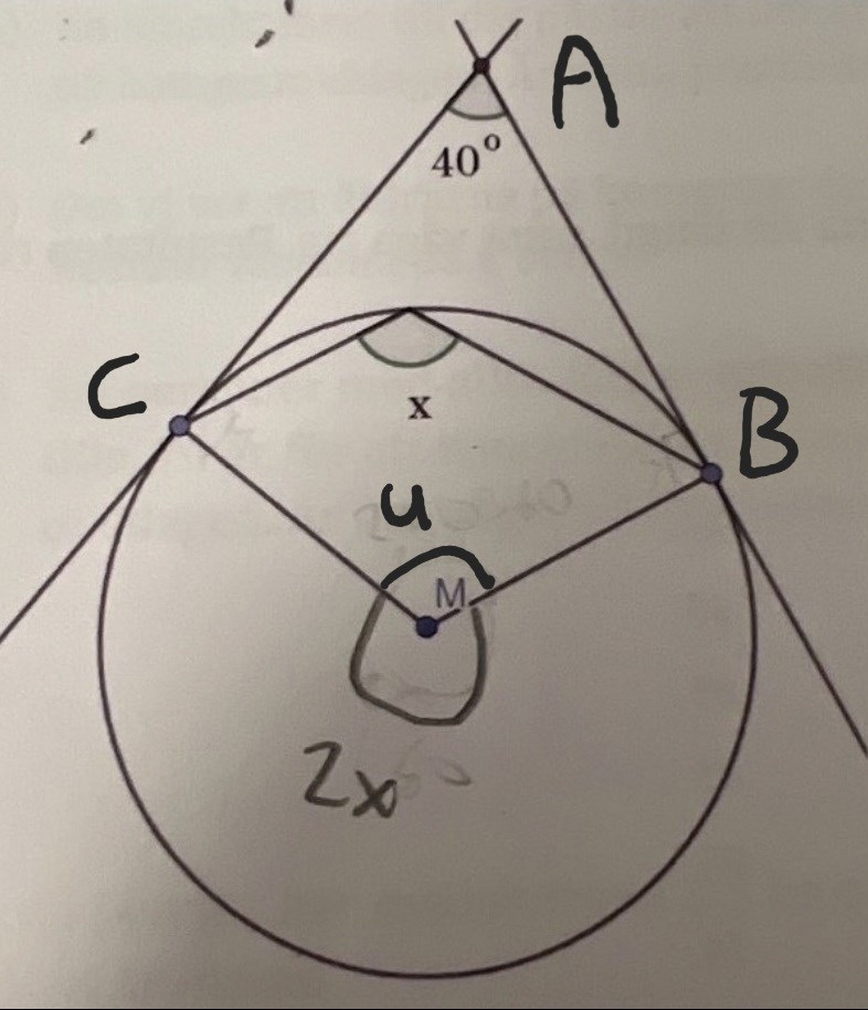 Utnyttja sedan att ABCM är en fyrhörning med känd vinkelsumma.