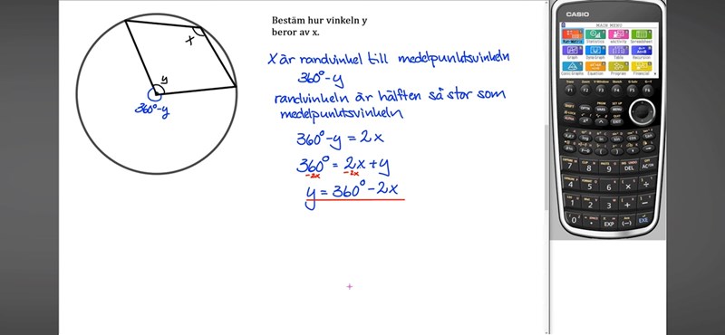 Eftersom vi i det här fallet har att medelpunktsvinkeln är 360°-y och randvinkeln är x så blir ekvationen 360°-y = 2x.