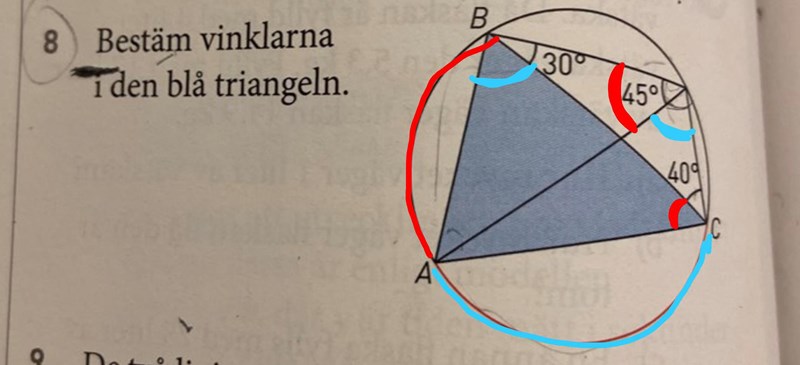 Ja det är fråga 8. Jag har läst ang cirkelbågar men jag förstår ändå inte riktigt. Jag hade uppskattat ifall någon hade kunnat förklara hur jag vet vilka vinklar som är lika stora osv.
