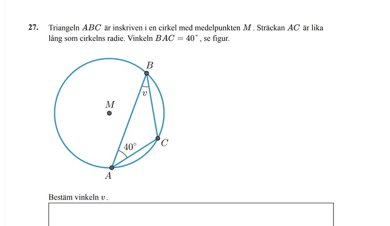 Jag har försökt lösa den här hur länge som helst. Jag förstår att A är en randvinkel av C och B vilket betyder att M blir 80* men mer än så har jag inte kunnat lösa